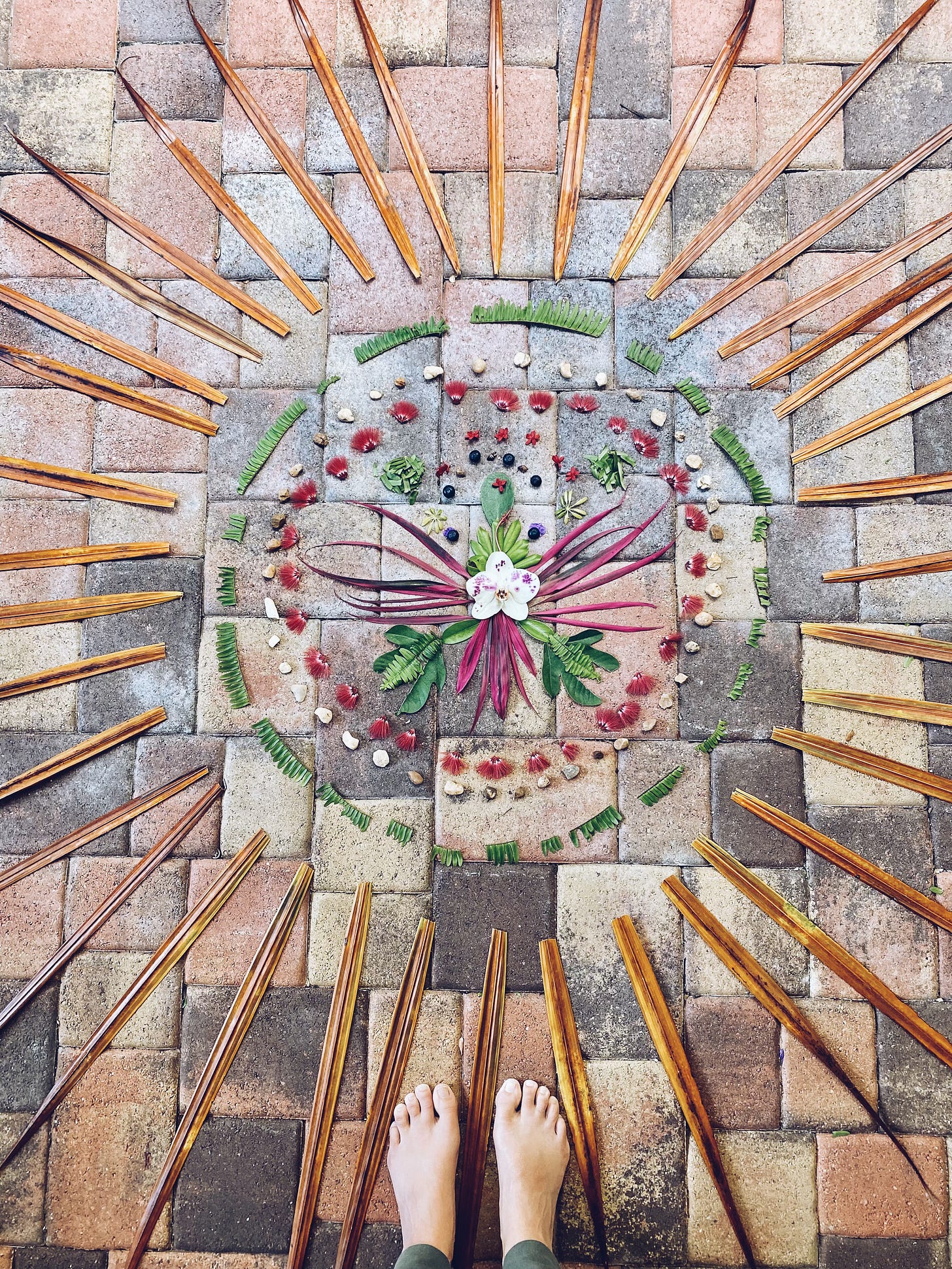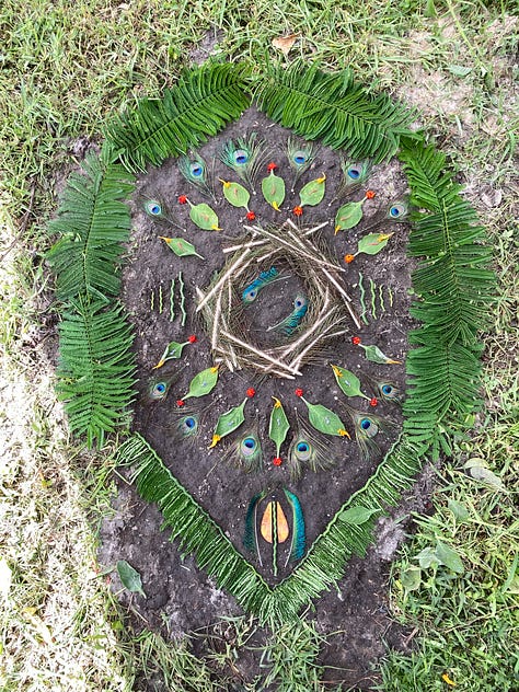 The first one I ever made was over six feet wide and took many sun-sweltering hours during a time where I was suffering daily with anxiety and depression. What came through was evidence that I could be struggling, I could be a mystery to myself, I could be unsure and scared and feel useless - and make something beautiful in the company of that feeling. I could carry myself from one place of possibility in myself, to another place. It changed my life forever. The tandem relationship between mess/grief/pain/mystery, love, and beauty would become a lens that informs much of how I see, now. Here is that altar: